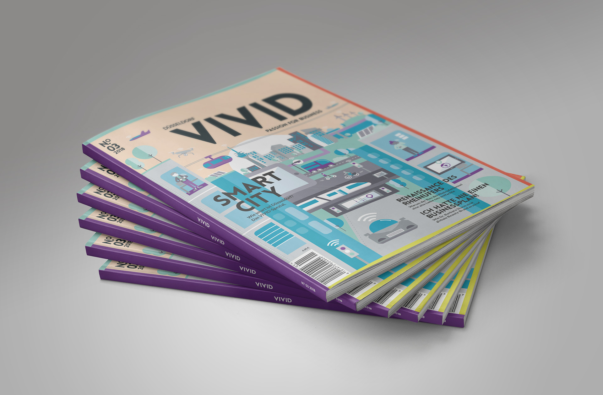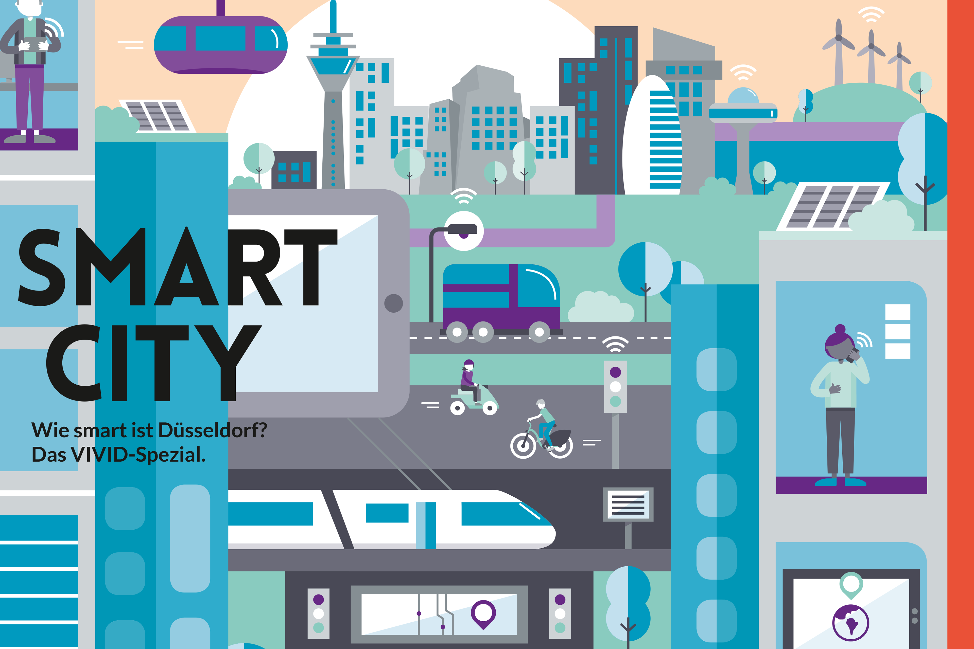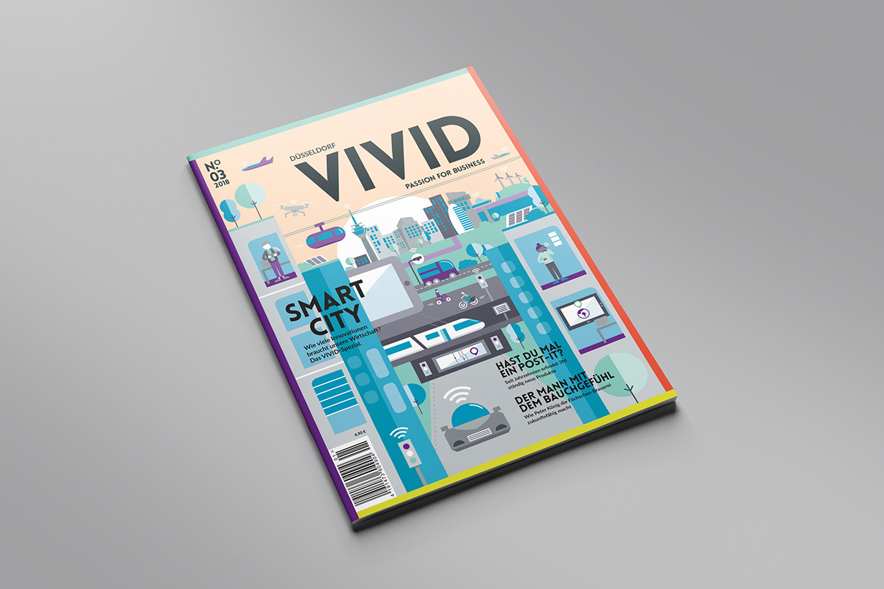 Cover-Illustration „Smart City“ für das Vivid Magazin, dem Wirtschaftsmagazin aus Düsseldorf. Illustration einer zukunftsgewandten Stadt und ihrer Bewohner.